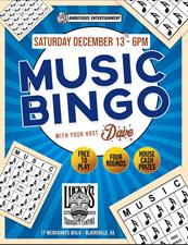 Mark your calendars — Music Bingo is back at Lucky’s on Saturday, December 13th from 6–8 PM!